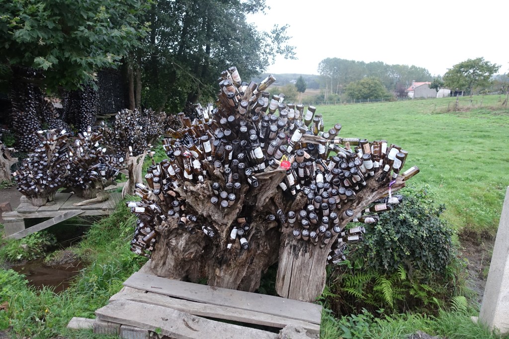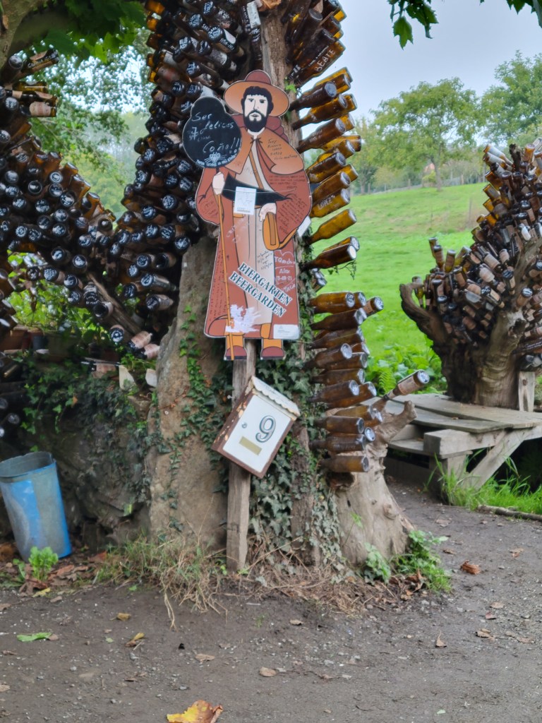 Our hotel was a few kilometers from the Camino path, so the expected 12 or so miles became 15. It was a relatively easy walk, a few ups & downs. We stopped for a café con leche once we found a bar that was open. And then we spotted the very memorable “Beer Garden”, with “trees” made of empty beer bottles. I’m certain that anyone who’s walked the French Way, the Primitivo, or the del Norte has taken pictures of this bar. Last time we must have arrived there later in the day, as there were a LOT of people, many drinking beer in the late morning. This time, it was too early to be open. It appears that peregrinos leave their old shoes by this bar. Some are filled with dirt, and a few have plants growing in them.