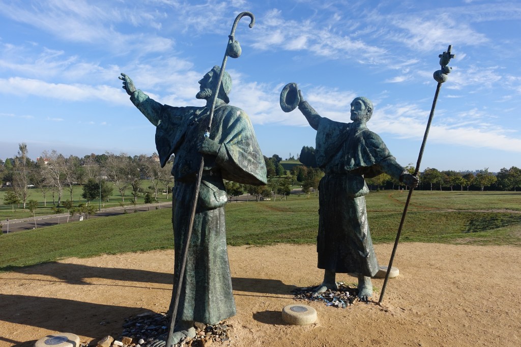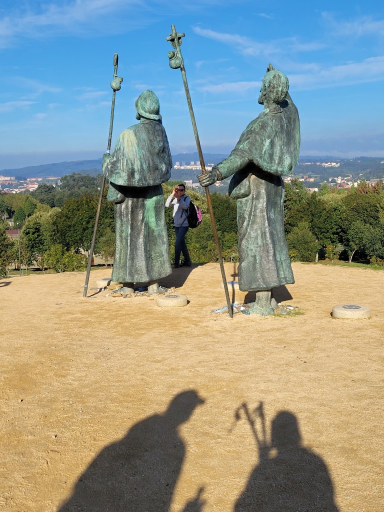 We set out on our final day on well-worn dirt trails in the fog. With only about 12 miles to go, we were happily anticipating our arrival in Santiago. We knew that we’d get to the Parque de Monte Gozo, where we would get our first glimpse of the Cathedral. We read that in the park there are statues of 2 pilgrims pointing toward the city. Unless you knew to deviate from the path (and the all-comforting arrows), you wouldn’t necessarily see the statues. But I’m getting ahead of myself.