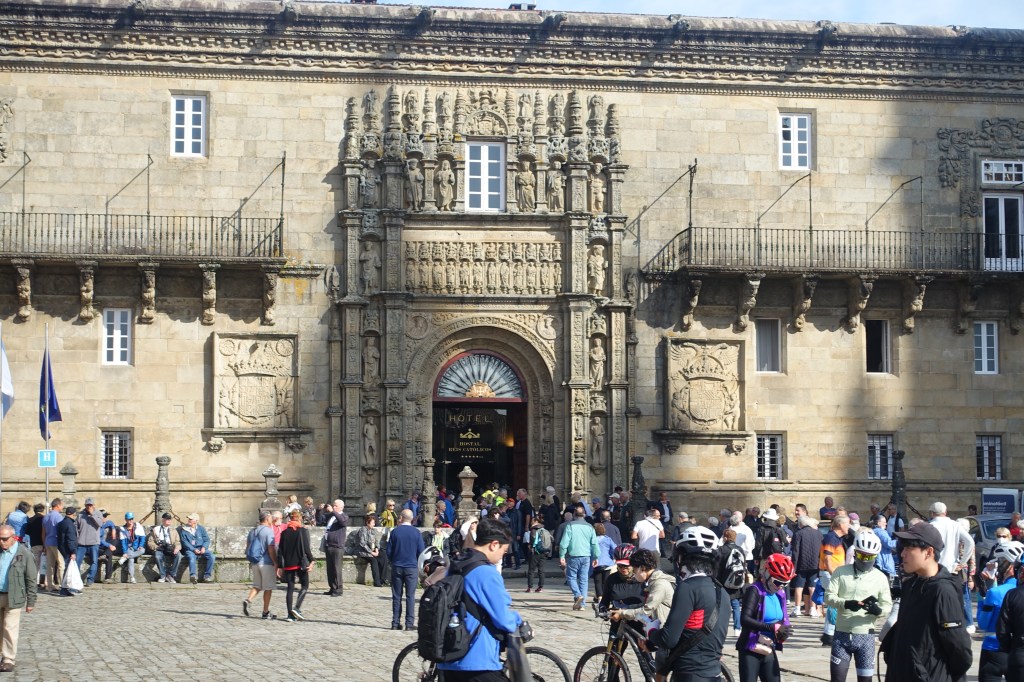 We finally checked into the absolutely gorgeous Hostal dos Reis Católicos Parador. I’d been in touch with our friend Garrett, who was leaving for Ireland that afternoon, to let him know when we arrived, and before we settled in, we met him for a glass (or two) of Champagne to celebrate seeing each other again, and completing another journey. Afterwards, we bid him a fond farewell, and went into “business” mode: unpacking and sorting our clothing and gear, showers, laundry, and packing a “Camino” suitcase to be shipped back to Park City while we extend our trip in Europe.