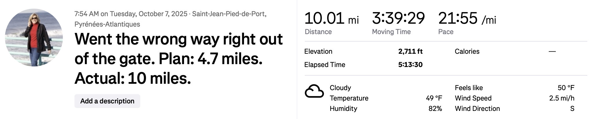 Starting in October instead of August like we’ve done on our prior Caminos, we started our trek at 7:45 instead of 6:00, thinking we’d be back in St. Jean by noon. Ha! From my Strava account: