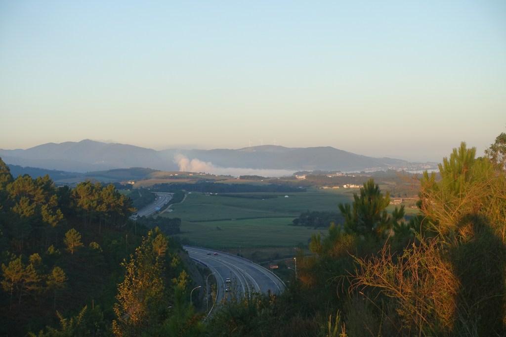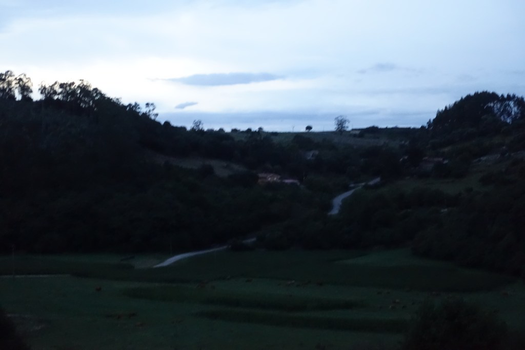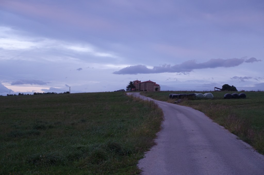 Starting before dawn with headlights, we have seen some beautiful sunrises. The last time we walked to Unquera, we walked by the beach. This time, we walked (unintentionally) inland. But the walk through a golf course, a partial rainbow, and a Maxfield Parrish sky made our wrong turn worthwhile.